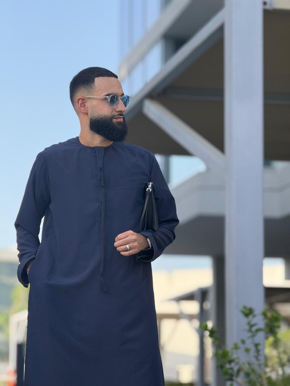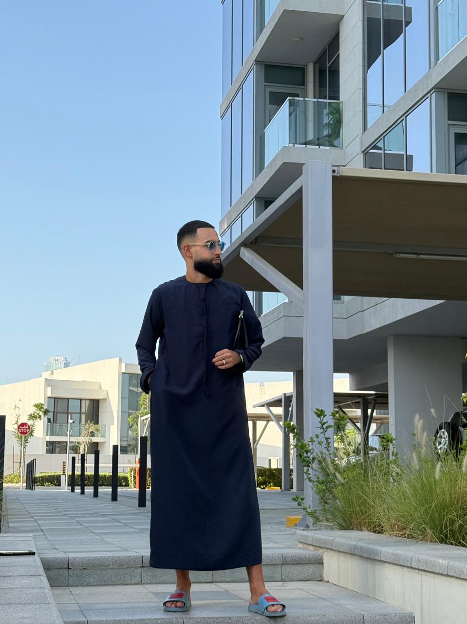 Découvrez l'excellence de notre qamis bleu foncé, alliant la fluidité du tissu dubaiote à l'élégance d'une boutonnière décorative amovible. Cette pièce unique vous offre la polyvalence d'une tenue traditionnelle qui s'adapte à toutes vos occasions.