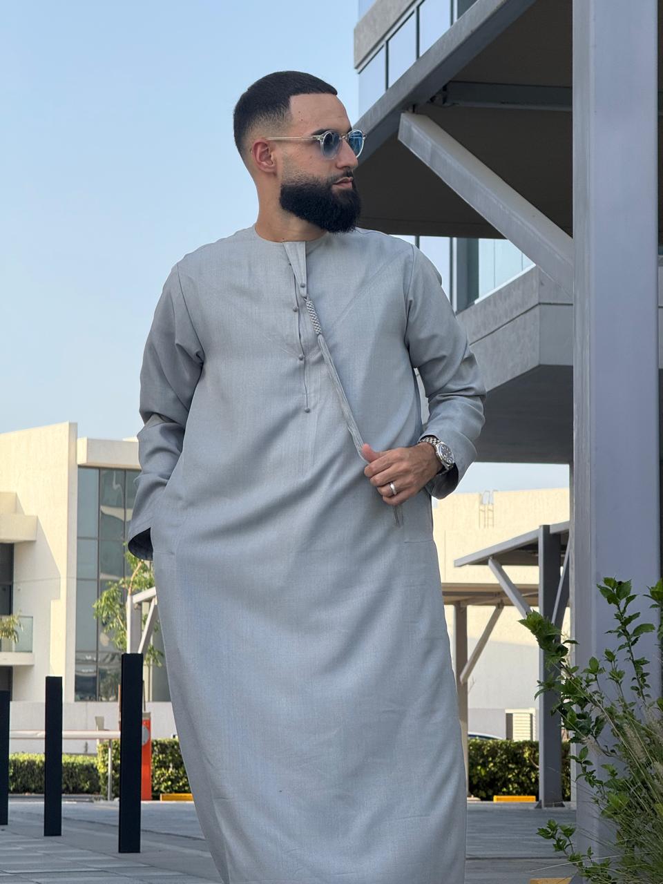 Découvrez notre qamis gris, une pièce d'exception où le savoir-faire de Dubaï rencontre la qualité des tissus saoudiens. Ce vêtement incarne la quintessence du raffinement arabe, alliant la coupe emblématique émiratie à la noblesse des étoffes d'Arabie Saoudite.